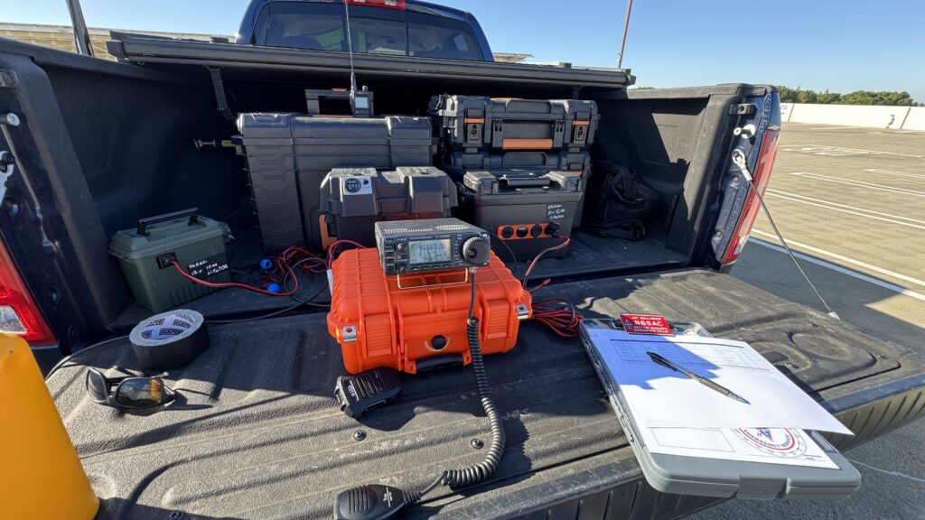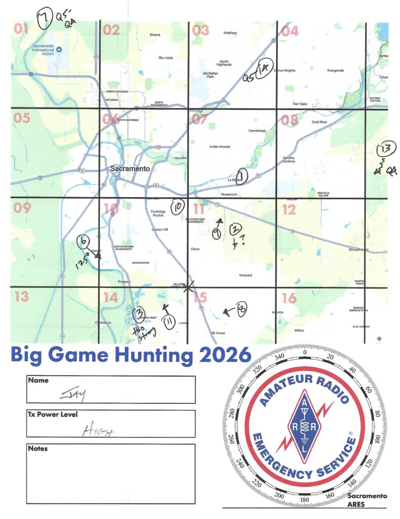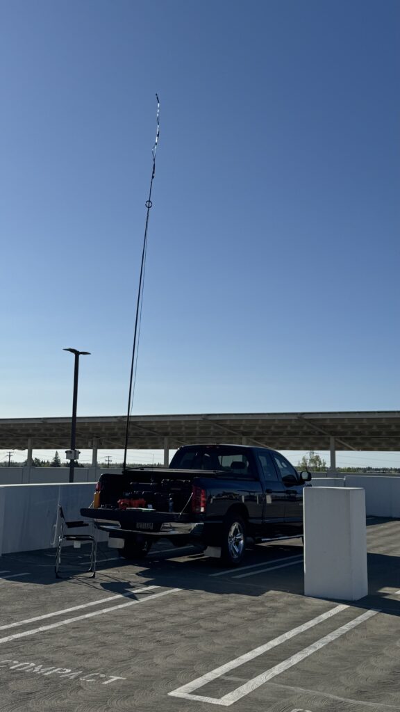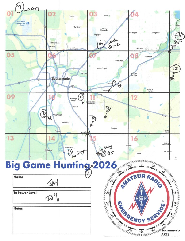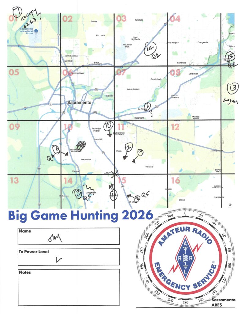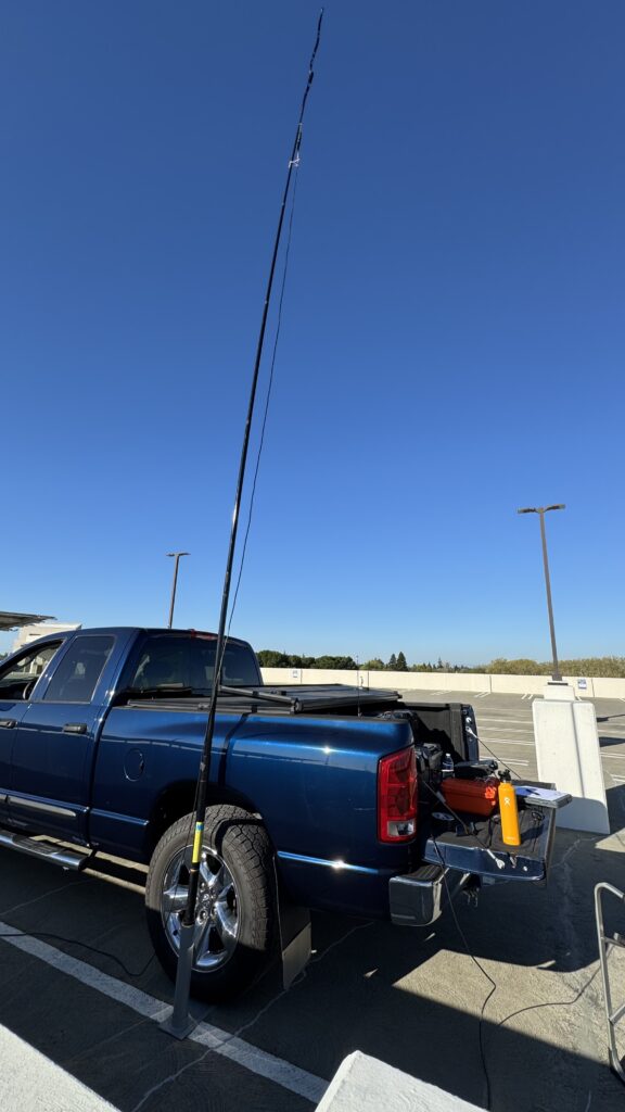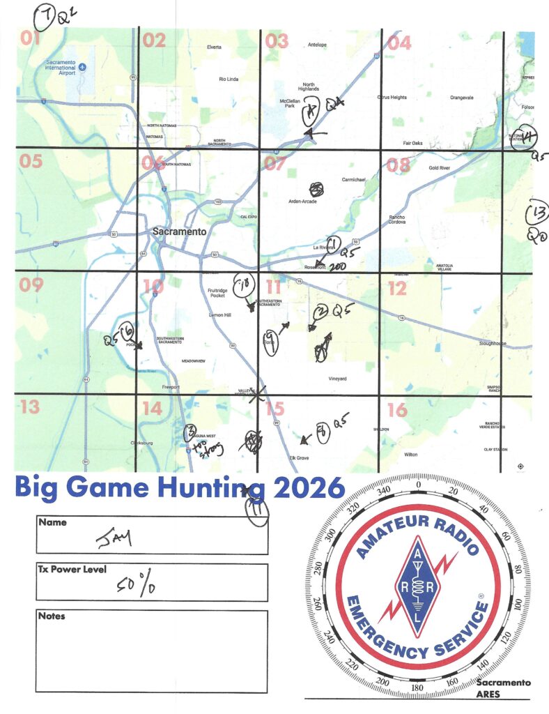 I was on the top floor of the parking garage at Consumnes River College. The garage was empty this Saturday morning. And, while there are arrays of solar panels, I picked a spot in the middle and elevated my antenna up above the panels. This was also to help ensure that my transmissions where as clear as possible. But, as in previous Big Game Hunting events (2024, 2025), I might have made it too easy.